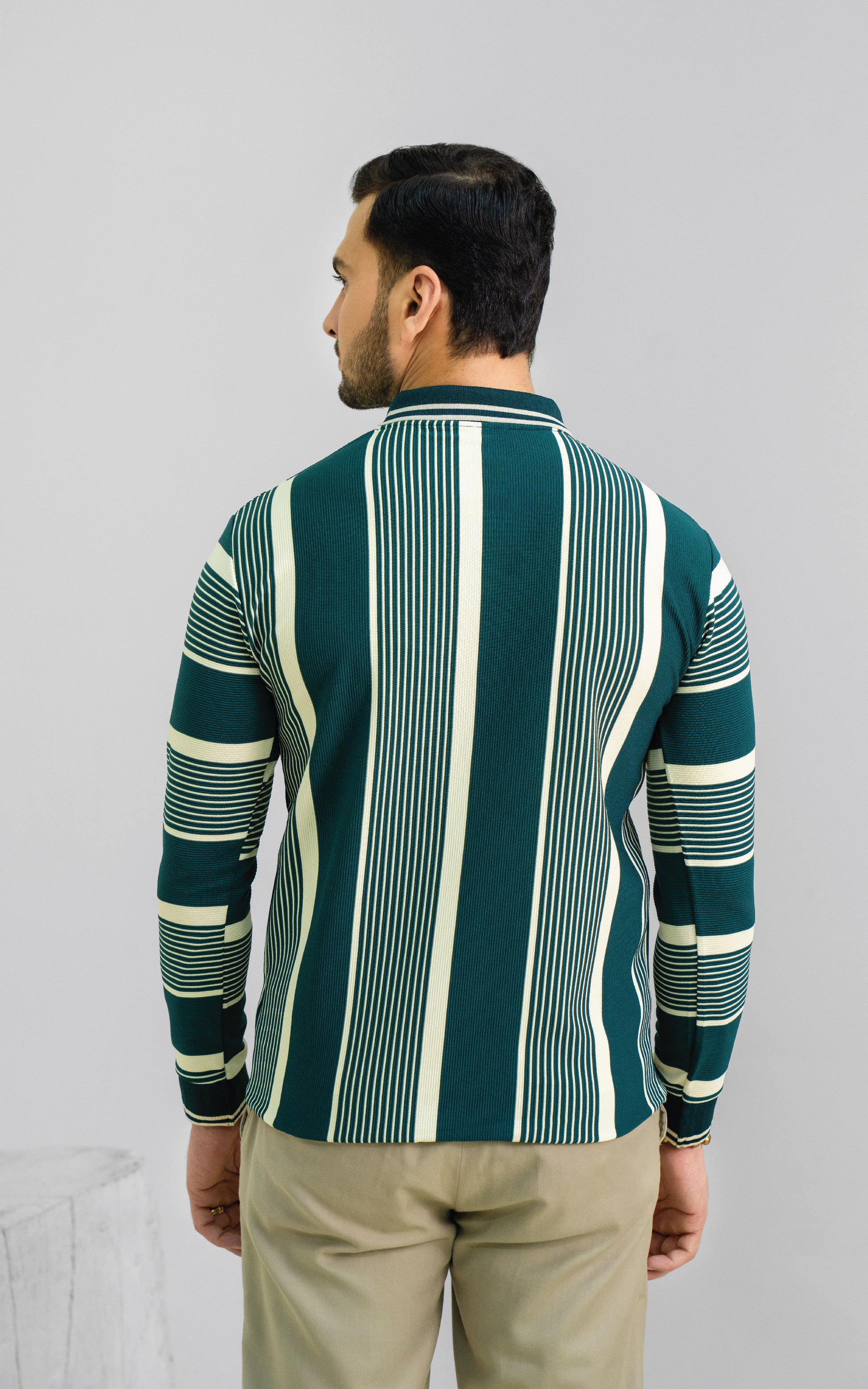 Green & Cream Vertical Striped Zipper Polo